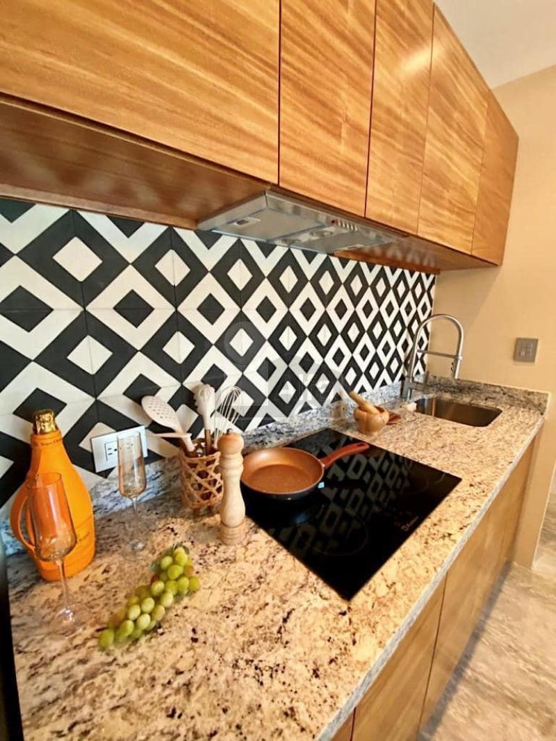Cocina, integrada a una estancia que invita a la convivencia, dos recámaras equipadas con camas King Size, clósets y baños, con sistema Lock-Off; El edificio ofrece seguridad las 24 horas, ascensor y estacionamiento subterráneo. Amenidades como: roof top con alberca y camastros, gimnasio equipado, jardines y conexión Wi-Fi en áreas comunes.