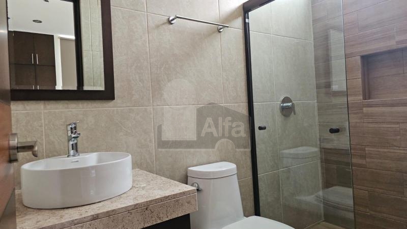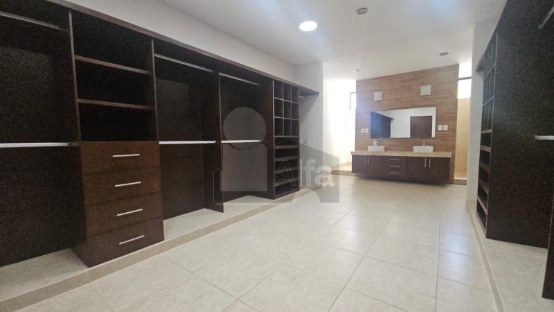 PLANTA ALTA: Recámara amplia principal con balcón y barandal de cristal templado, clóset vestidor de gran tamaño con zapateras y cajoneras, baño con doble lavabo y meseta de granito; primera recámara secundaria con clóset de madera con cajoneras, baño con meseta de granito y persianas blackout; segunda recámara secundaria con clóset de madera, baño con cancel de cristal templado y cortinas blackout; clóset de blancos y área de escalera de granito, barandales de madera y acero inoxidable, tragaluces de luz natural.